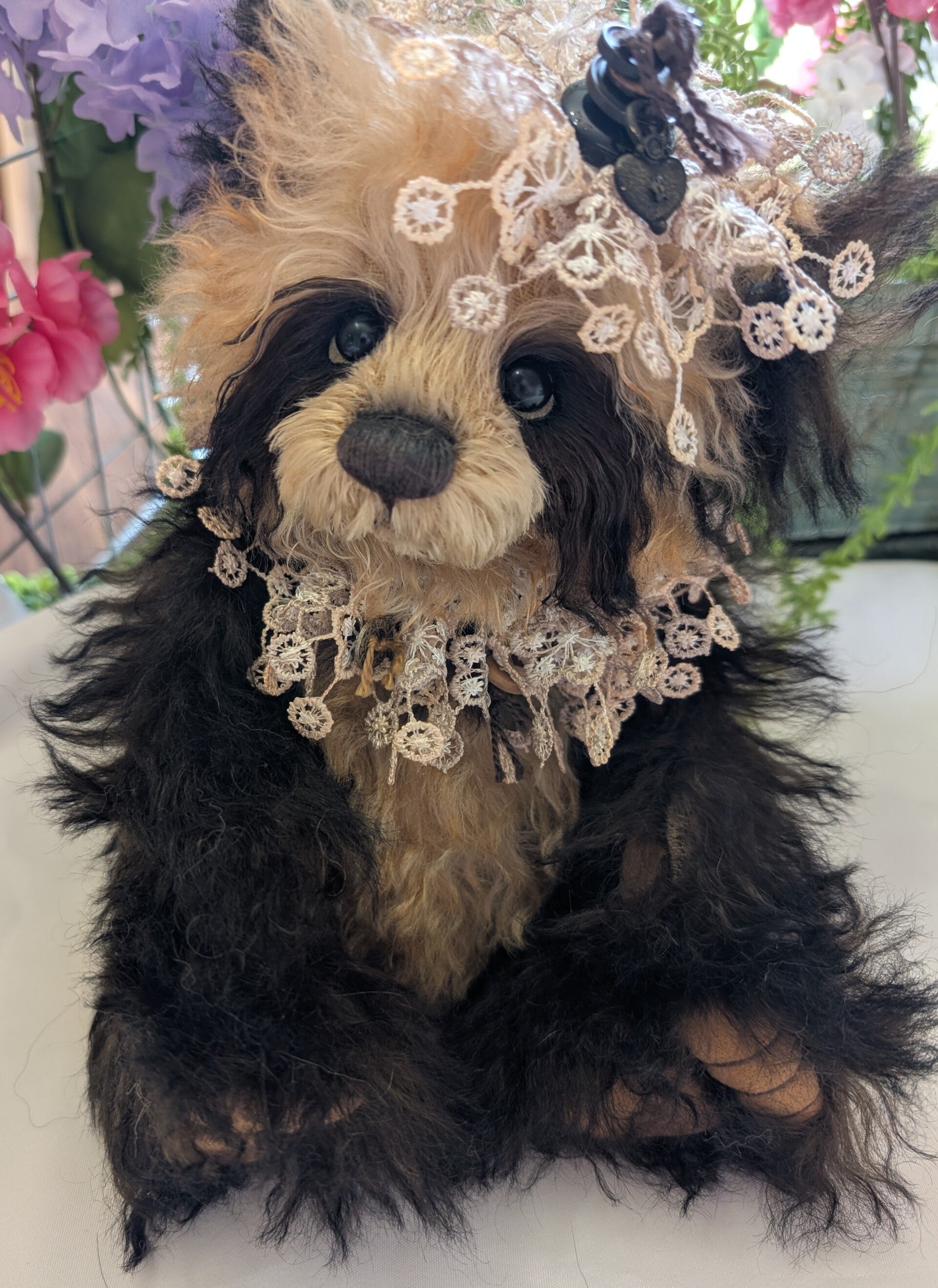 Designed by Isabell Lee and Charlotte Morris. Jubilee is hand-crafted from Alpaca & Mohair fur in warm black and cream tones. Jubilee comes with her own bag and wearing a vintage-styled collar and matching headpiece. Jubilee is ready to party and kick up her heels at the Marti Grass.